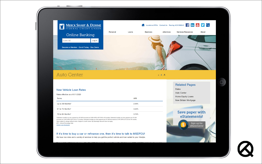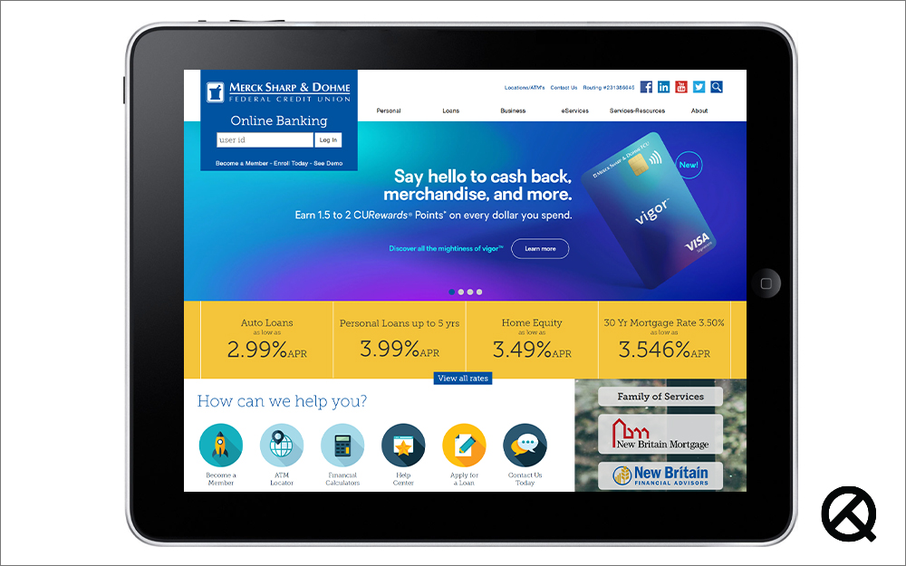 Merck Sharp & Dohme FCU knew it was time for a website redesign. We took advantage of their brand's bright color palette to give the site a friendly and open look. Their unique design encourages their users to scroll through and take a look at the different offers/services available to them. Their homepage features important rates, a social media feed, and several areas for marketing opportunities.